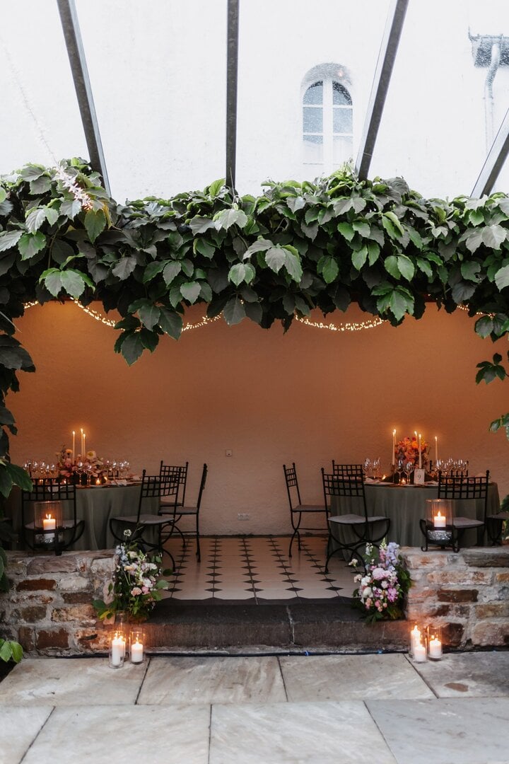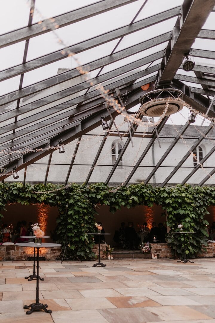 Wenn sich die Feier dann im Laufe des Abends nach Innen verlagert, geht es mindestens genauso atemberaubend weiter. Das Foyer bietet einen wunderschönen Eintritt in das Klostergut und der Kreuzgang unter einem Glasdach die perfekte Dinner Location.
