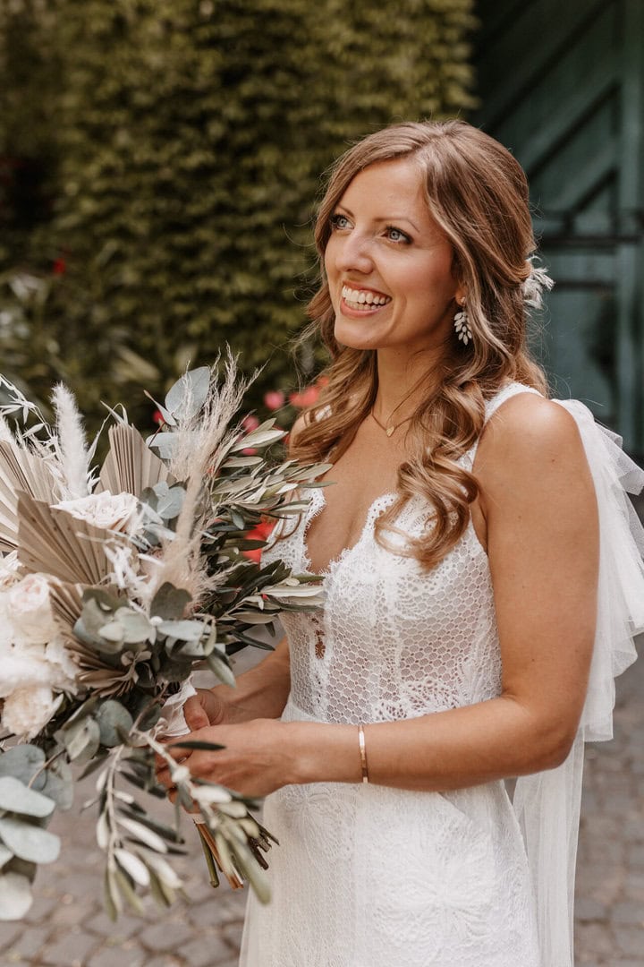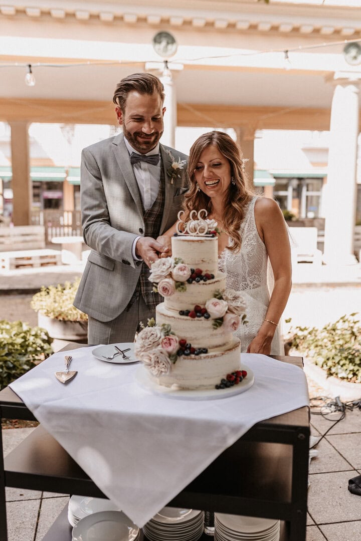 Eine wunderschöne Location, die durch die liebevolle Dekoration von „Zauberhaft Dekoration“, „Tischlein fein“ und „Makrameetrulla“ passend im Boho-Stil dekoriert wurde. Hier gab es im Outdoor Bereich einen richtig schönen Sektempfang mit anschließender Präsentation und Anschnitt der Hochzeitstorte.